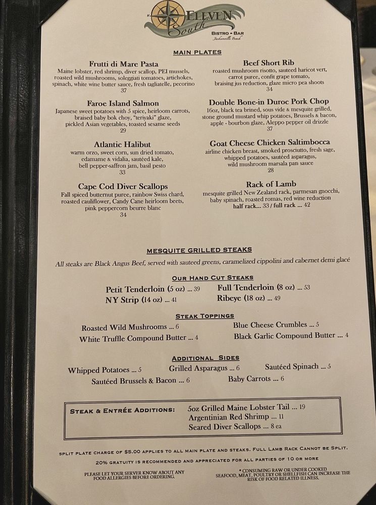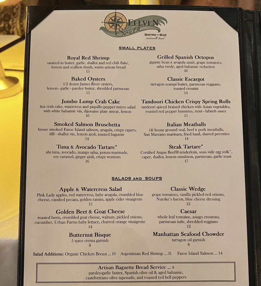 Introducing Eleven South, a tapas/small plates restaurant in Jacksonville Beach, FL. This New American eatery offers a classy ambiance with options like crab artichoke fondue, jumbo blue crab claws, and house-made empanadas for starters. Delight in Southwest salads, peaches and cream salads, and watermelon and goat cheese salads. Don't miss out on the Minorcan seafood chowder soup! Customers rave about the exceptional food, top-notch service, and vibrant atmosphere. Reviews mention standout dishes like halibut, shrimp appetizers, steak tartare, and the melon/feta salad. The outdoor seating area is cozy, perfect for special occasions. Eleven South is a great spot for a romantic dinner or a team outing, with valet parking available. Experience the best of fine dining, Happy Hour specials, and a full bar at Eleven South - a must-visit restaurant for food enthusiasts.